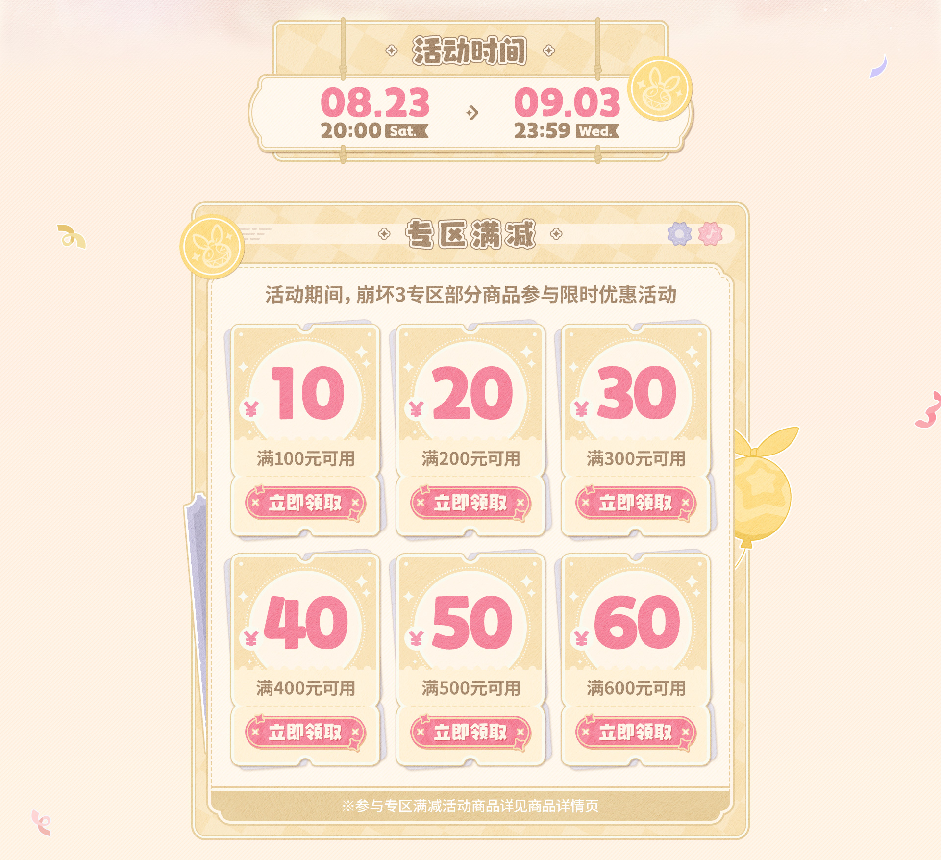 - 할인 이벤트는 붕괴3 전용 구역 일부 상품 한정으로 적용