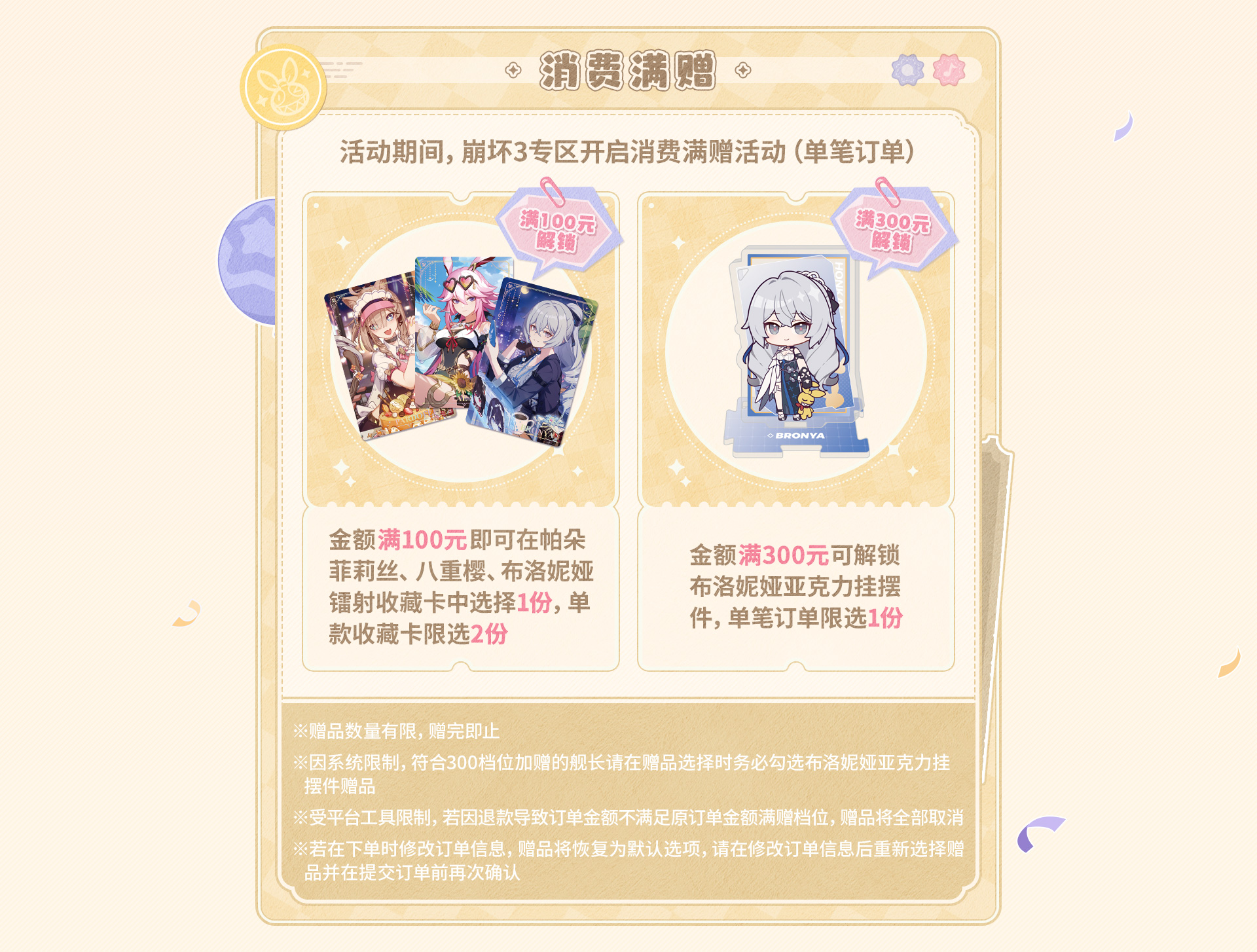 - 단일 주문에서 붕괴3 주변 굿즈 실결제 금액 100위안 달성 시 → 1회 추첨 기회