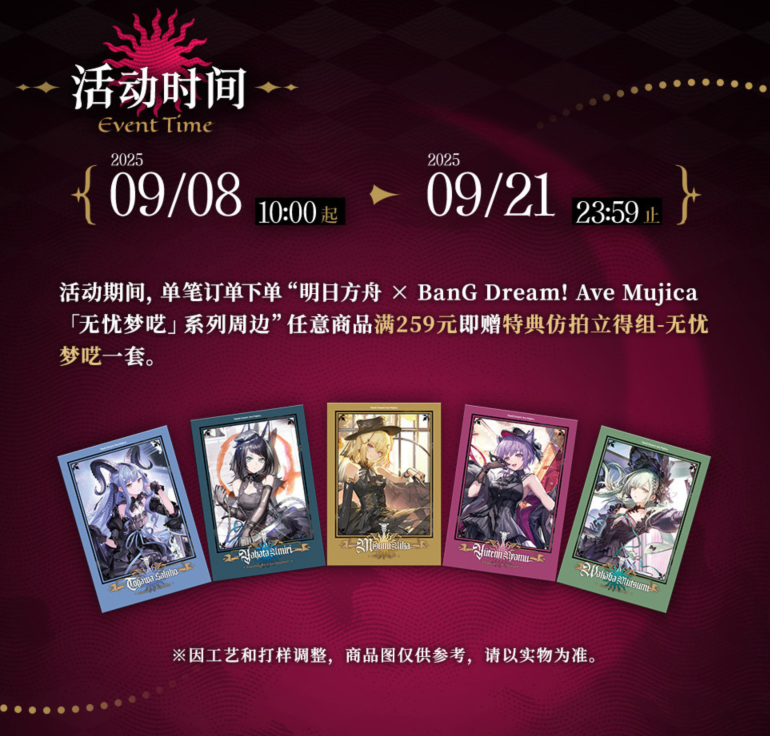 - 명일방주 × BanG Dream! Ave Mujica 시리즈 굿즈 단일 주문 259위안 이상 구매 시, 폴라로이드 카드 1세트 증정